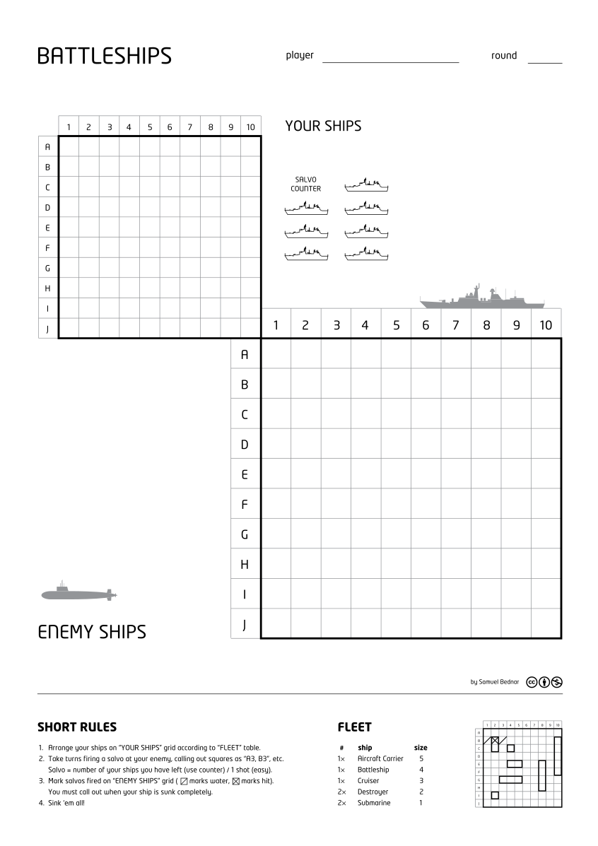 Battleship is a strategy type guessing game for two players. It is played on ruled grids (paper or board) on which each player's fleet of ships (including battleships) are marked. The locations of the fleets are concealed from the other player. Players alternate turns calling "shots" at the other player's ships, and the objective of the game is to destroy the opposing player's fleet.
